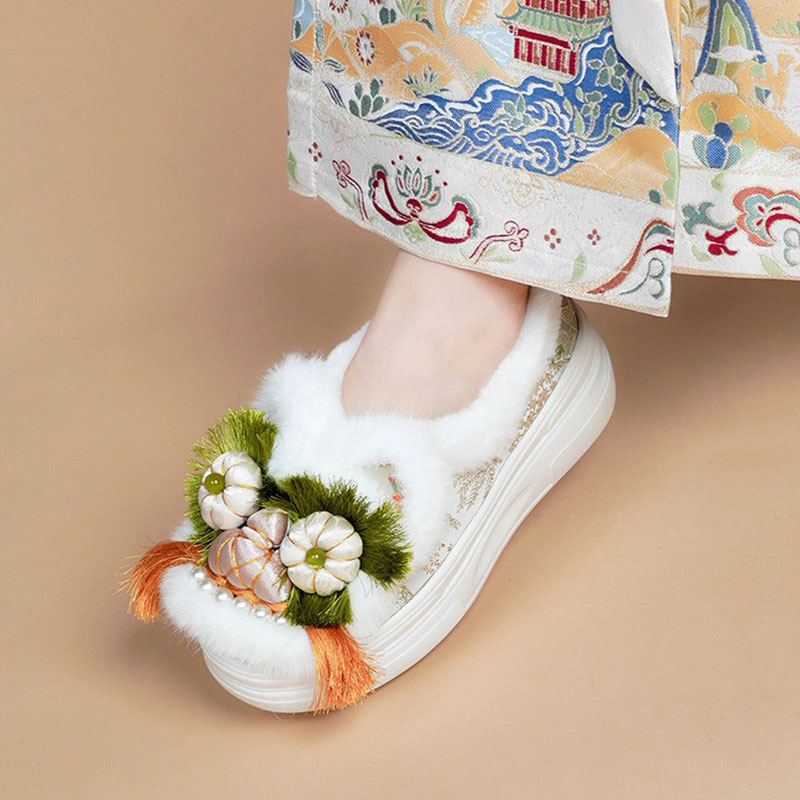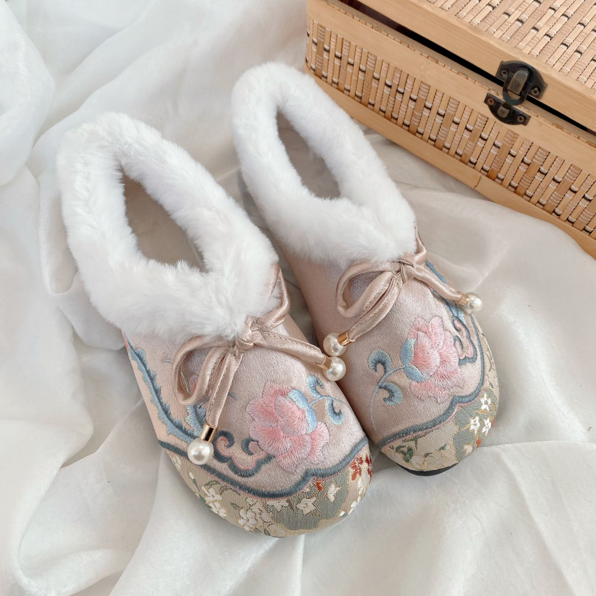 冬季手工民族风加绒保暖虎头鞋古风老北京布鞋软底汉服绣花女棉鞋