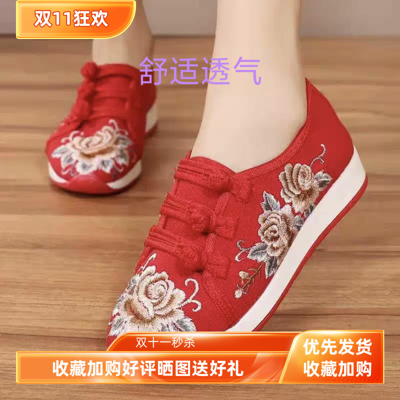 老北京布鞋女鞋春夏季民族风绣花鞋坡跟单鞋内增高厚底红色结婚鞋