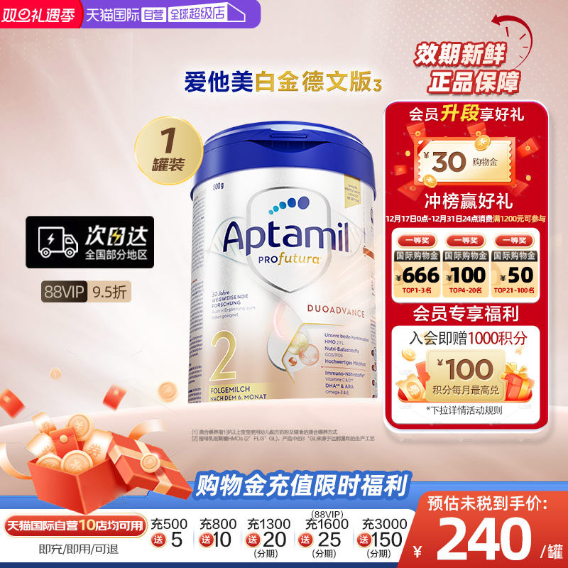 【自营】爱他美白金德文版³婴幼儿配方奶粉2段德国进口800g德国