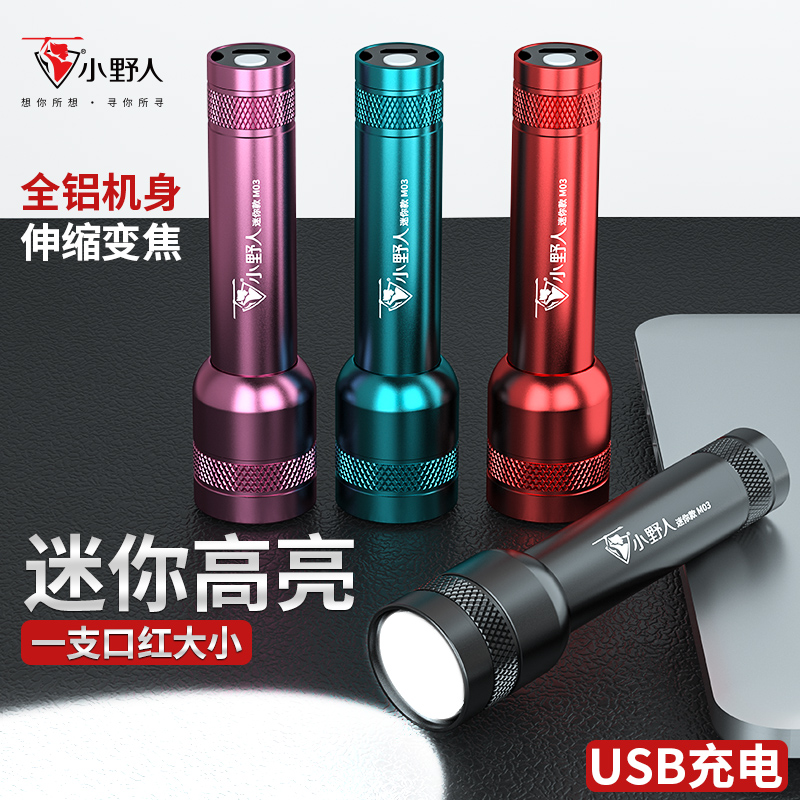小野人强光手电筒USB可充电小巧迷你家用宿舍携带LED小型便携超亮