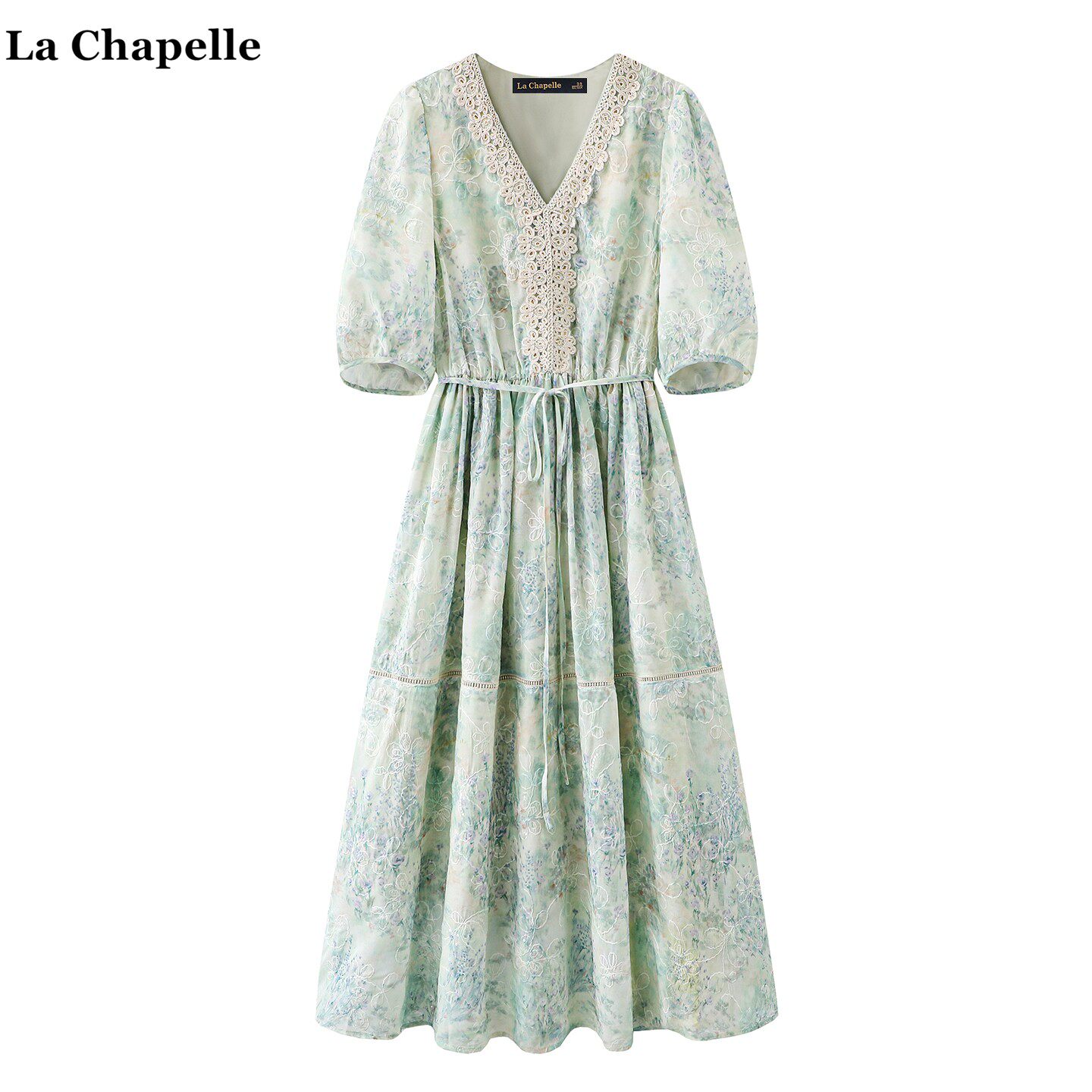 拉夏贝尔/La Chapelle波西米亚碎花连衣裙女夏季新款蕾丝v领长裙