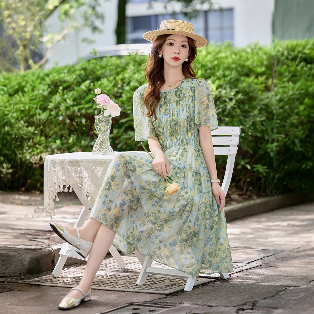 - 长款碎花 雪纺连衣裙