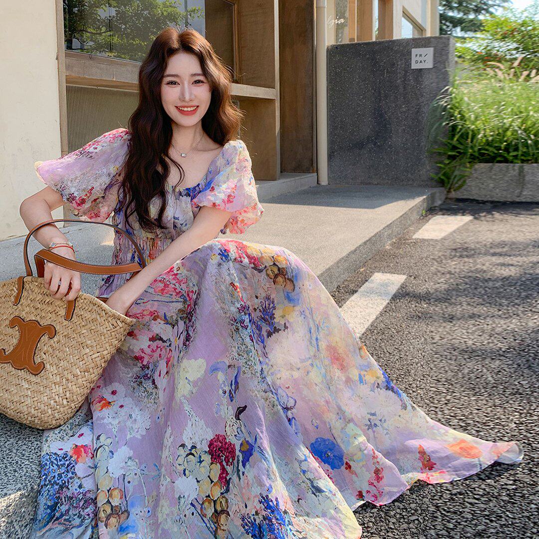 高级感时尚泡泡袖碎花连衣裙女夏波西米亚度假褶皱收腰显瘦中长裙