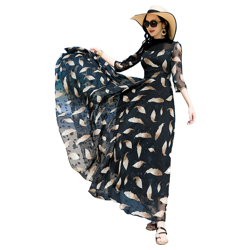 2021波西米亚长裙长袖大摆碎花脚踝过膝黑色收腰沙滩雪纺连衣裙女