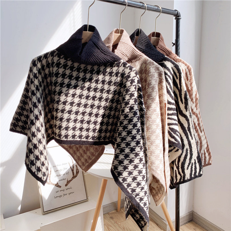 秋冬不规则外搭高领披肩圆领针织毛衣千鸟格开叉套头斗篷外套保暖