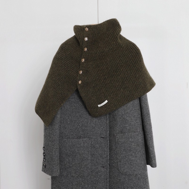 开叉套头针织披肩搭配用保暖围脖不规则纽扣斗篷咖色高领含羊毛女