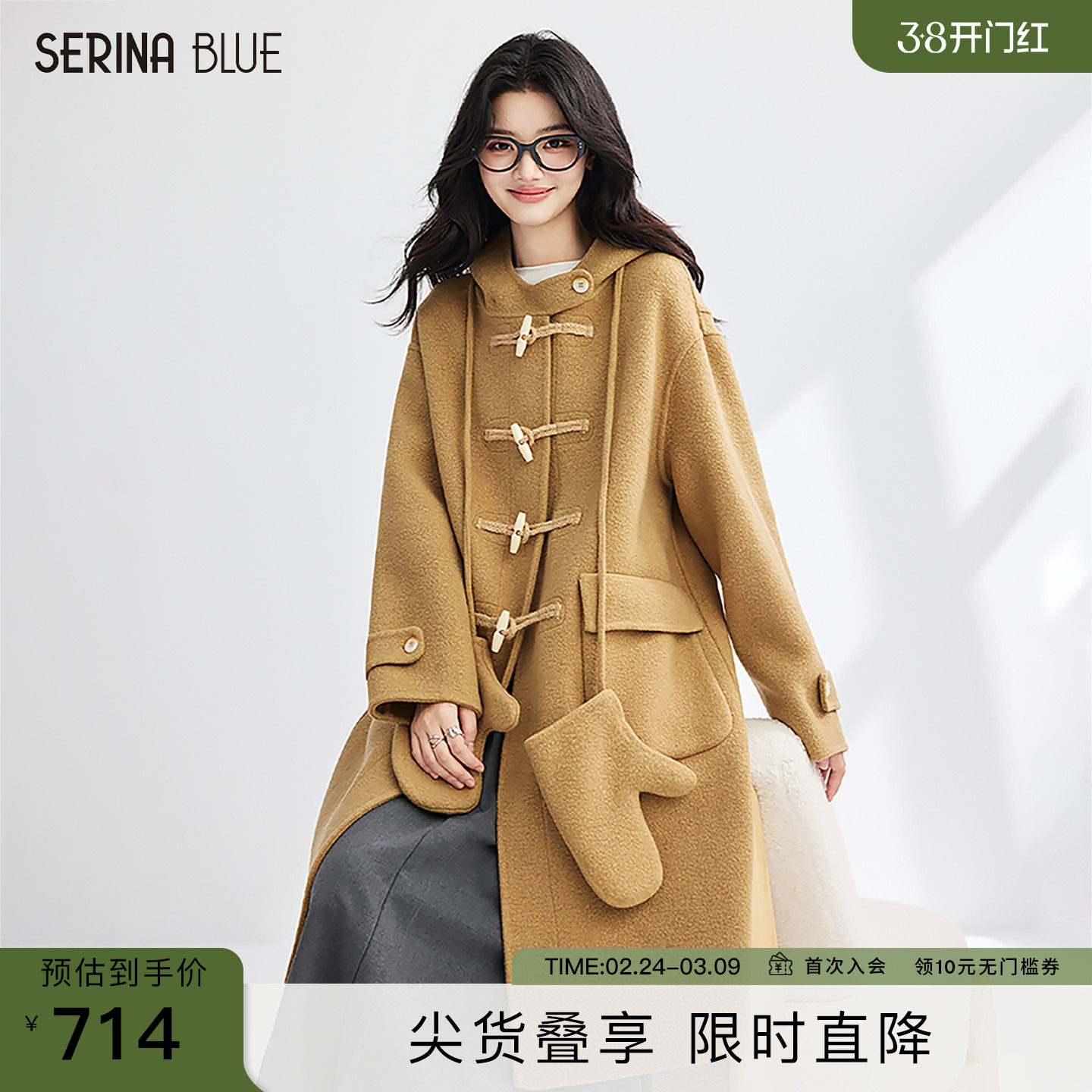 SeRinaBlue2026年春季新款连帽牛角扣女士双面呢羊毛气质大衣外套