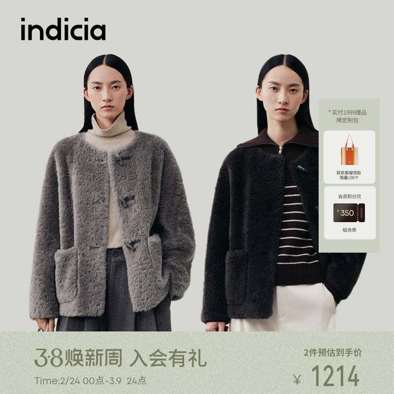 indicia标记羊羔毛短款咖色牛角扣女厚外套2025春冬新款L2D5WT259