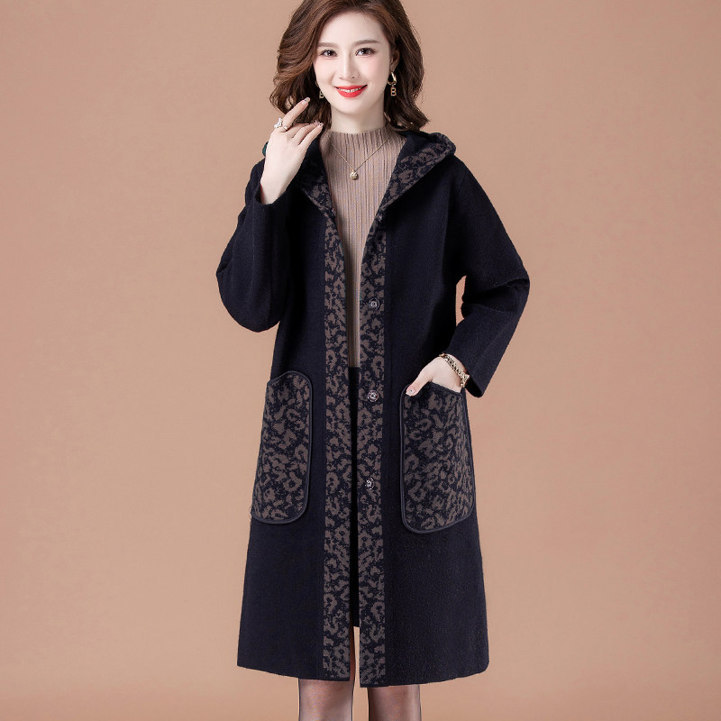 慵懒风连帽毛呢大衣外套女毛衣中长款针织开衫加厚秋冬中老年妈妈