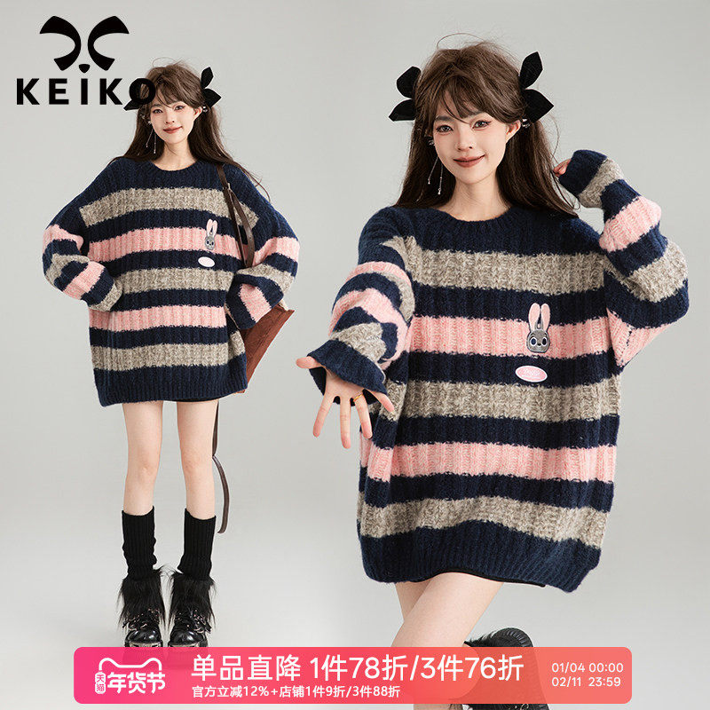 KEIKO 松弛感粗针条纹毛衣女25秋冬慵懒撞色中长款遮屁股针织衫