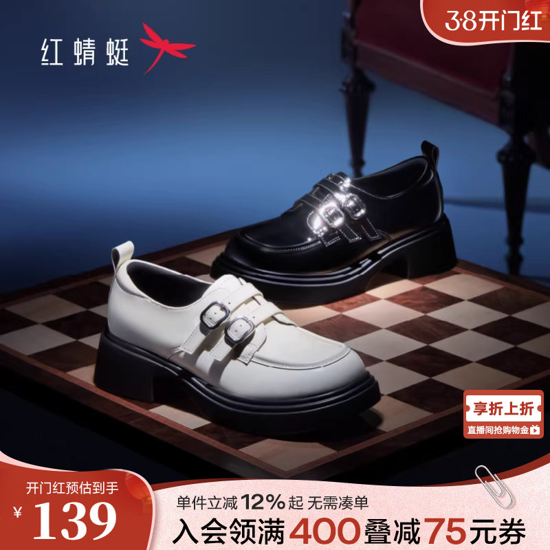 红蜻蜓双倍乐福鞋女鞋厚底粗跟复古英伦风小皮鞋百搭黑色休闲单鞋