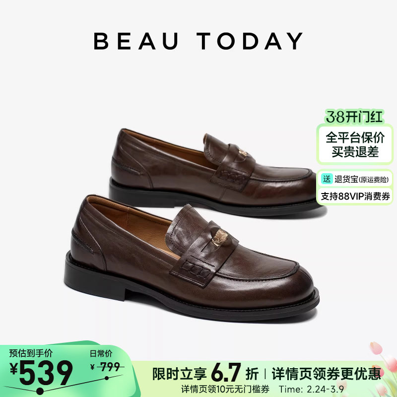 【焦糖金币】BeauToday乐福鞋女真皮英伦风小皮鞋一脚蹬棕色单鞋