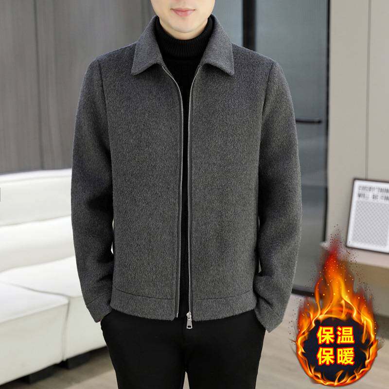 100%纯羊毛外套男士夹克秋冬装翻领短款爸爸有口袋双面尼毛呢大衣