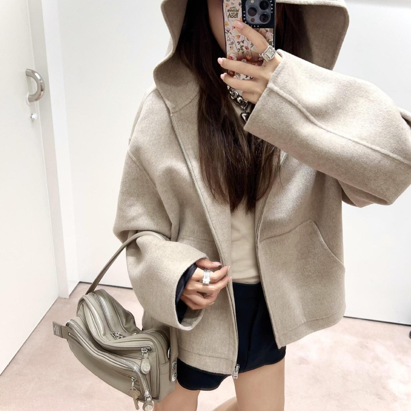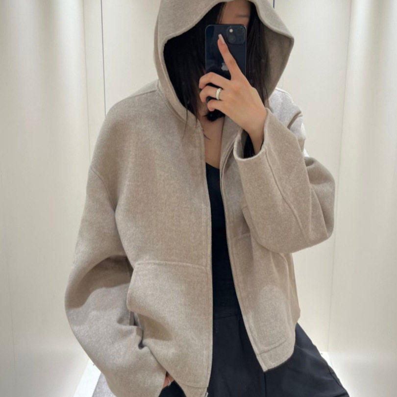 26新款AC同款宽松简约羊毛混纺拉链连帽外套双面尼短大衣男女同款