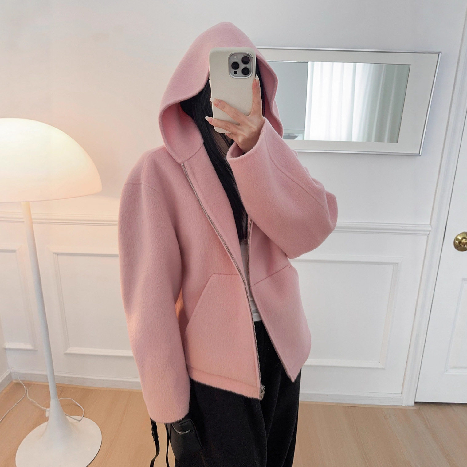 26新款粉色双面尼短拉链连帽外套AC男女同款宽松休闲羊毛混纺大衣