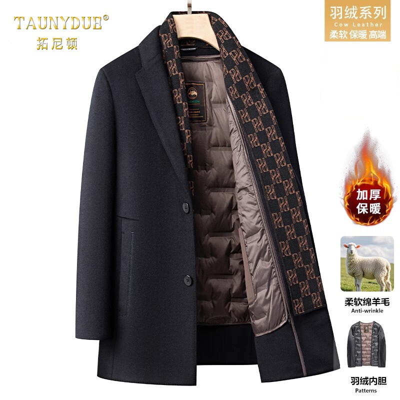 脱卸白鸭绒内胆中长款翻领羊毛混纺冬季双面呢男士毛尼大衣铭盛缘
