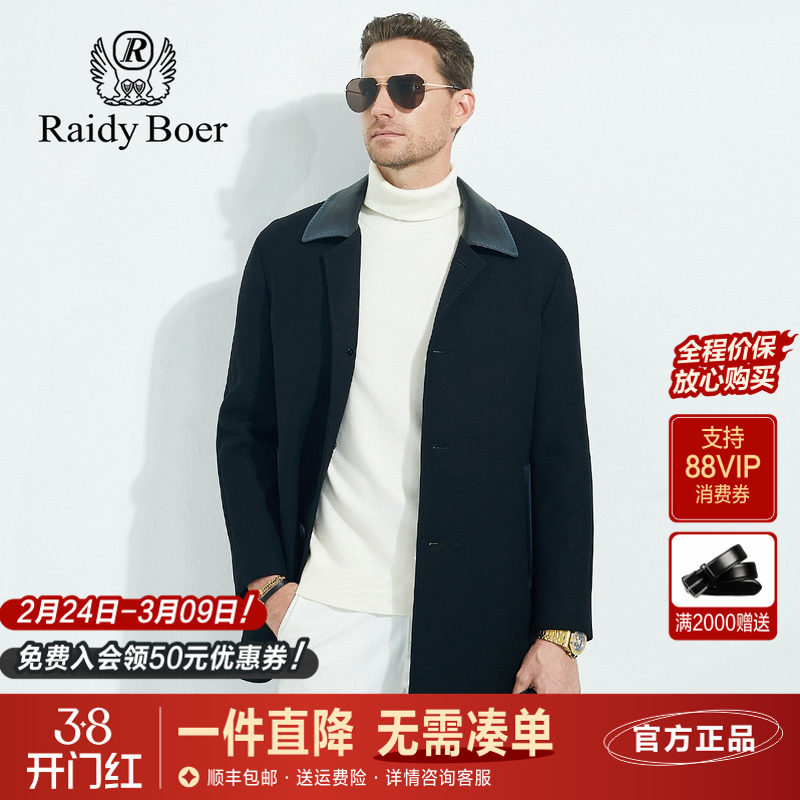 雷迪波尔男装大衣2023秋冬新款绵羊皮翻领羊毛尼中长纯色商务外套