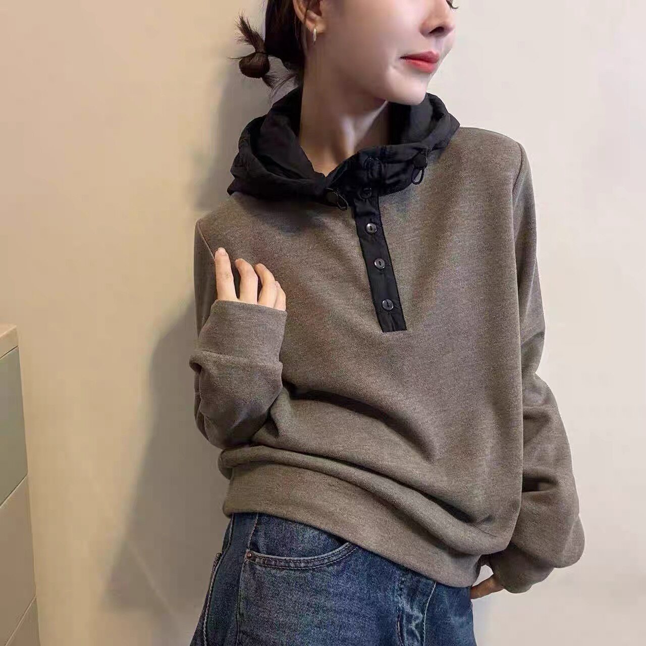 欧版 31180 拼色连帽开领长袖德绒羊毛套头女新款简约风休闲卫衣