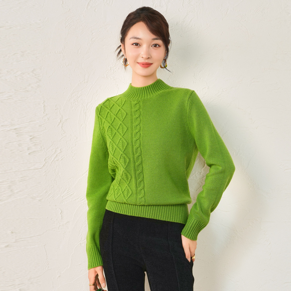 春竹~25秋冬新款无缝半高领扭花羊毛衫100%纯羊毛套头女上衣