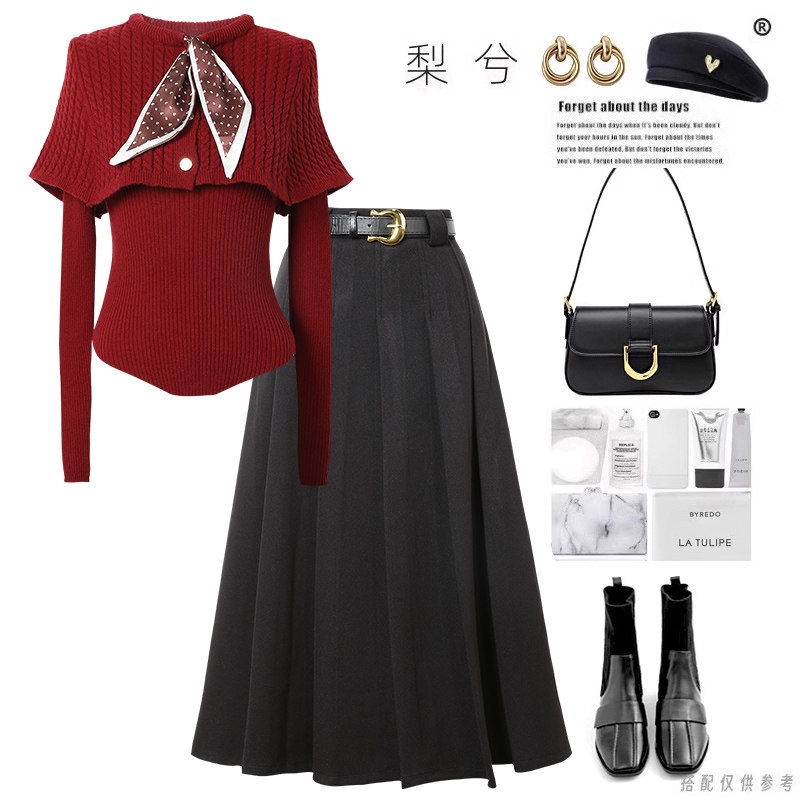 专柜同款冬季厚款绑丝带披肩长袖毛衣毛呢半身裙两件套打底裙套装