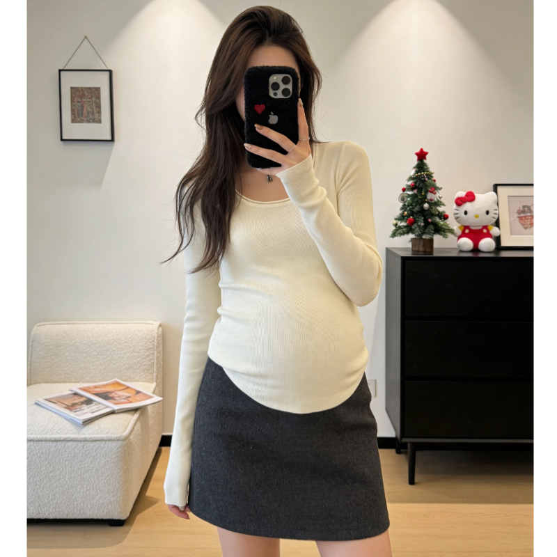 孕妇针织u领打底衫秋冬新款时尚锁骨t上衣长袖灰色毛呢半身裙短裙