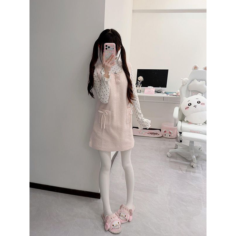 新款温柔甜妹减龄感粉色毛呢背带连衣裙+波点长袖打底衫两件套装