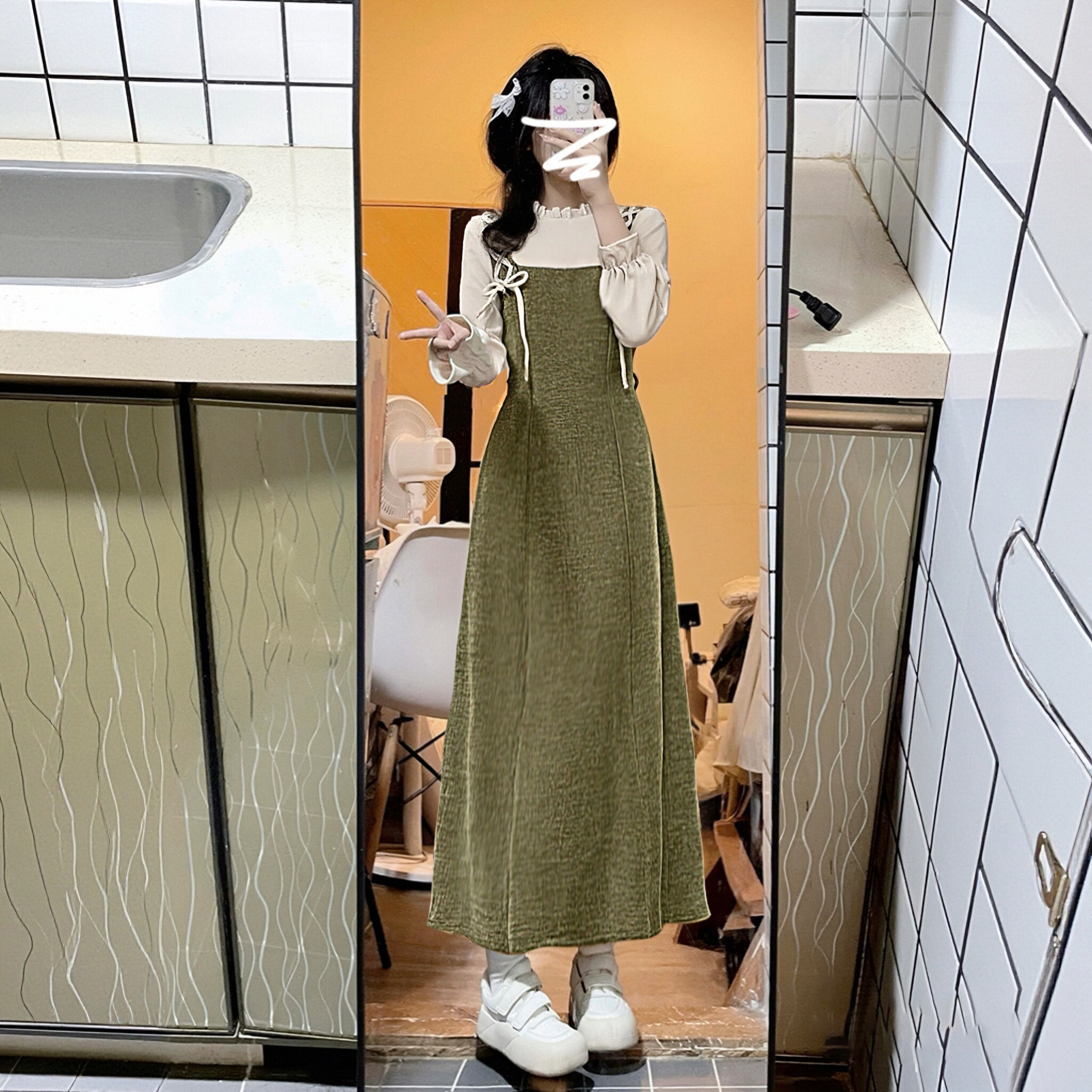 碎花毛呢连衣裙韩系蕾丝半高领长袖打底衫内搭叠穿气质两件套装女
