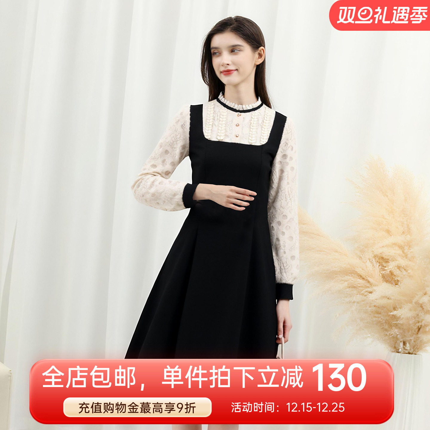 未风黑色毛呢连衣裙女冬2025冬季新款气质假两件长袖打底内搭裙子