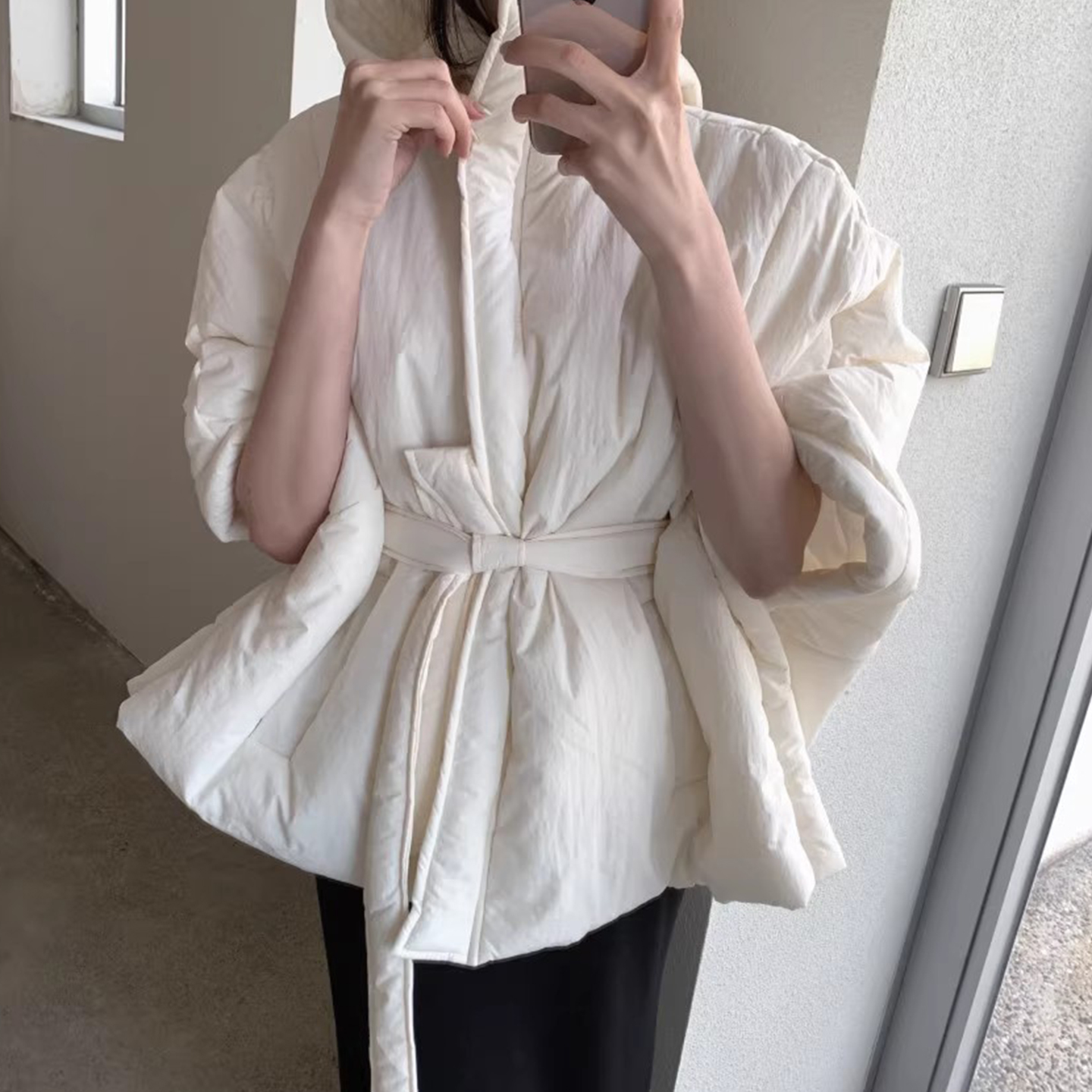 设计感绑带收腰斗篷式连帽棉衣外套2025冬季新款小众百搭别致上衣