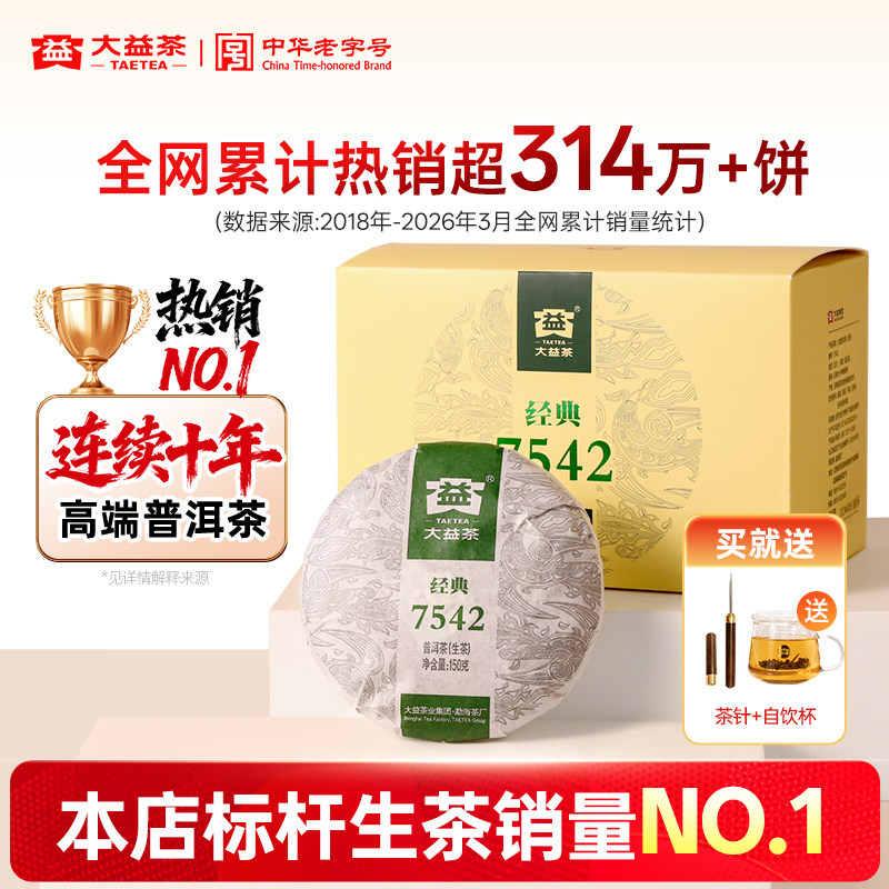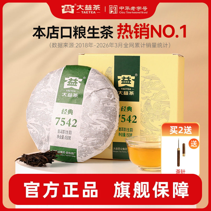 大益普洱茶7542经典标杆饼茶口粮茶叶150g生茶回甘官方旗舰店