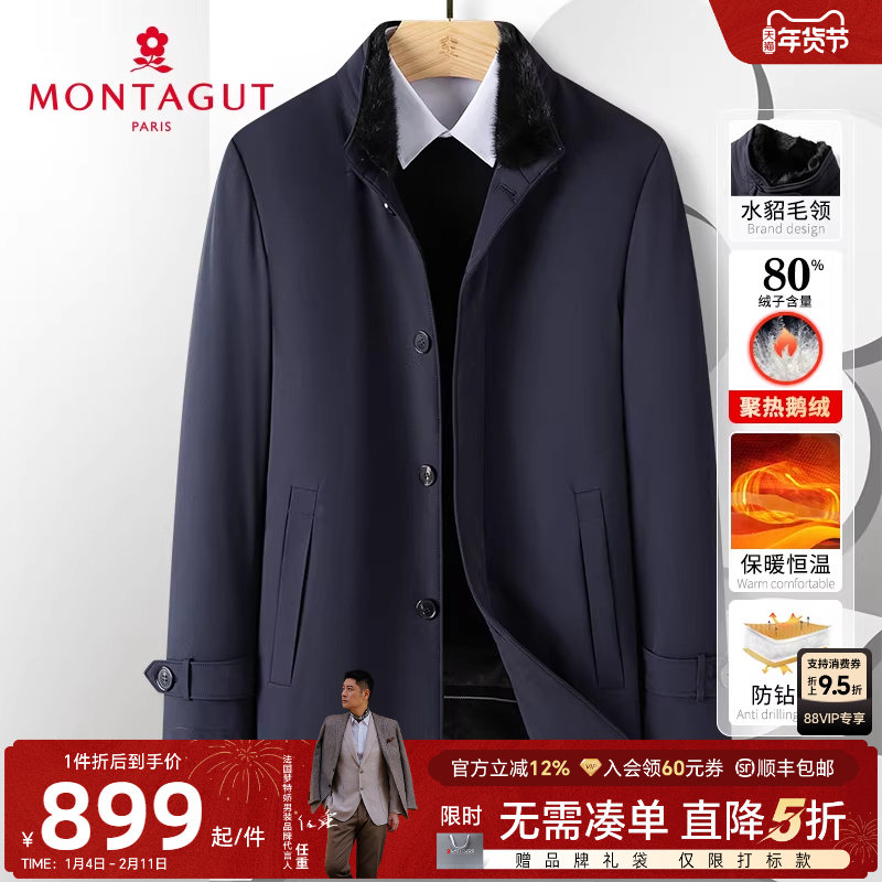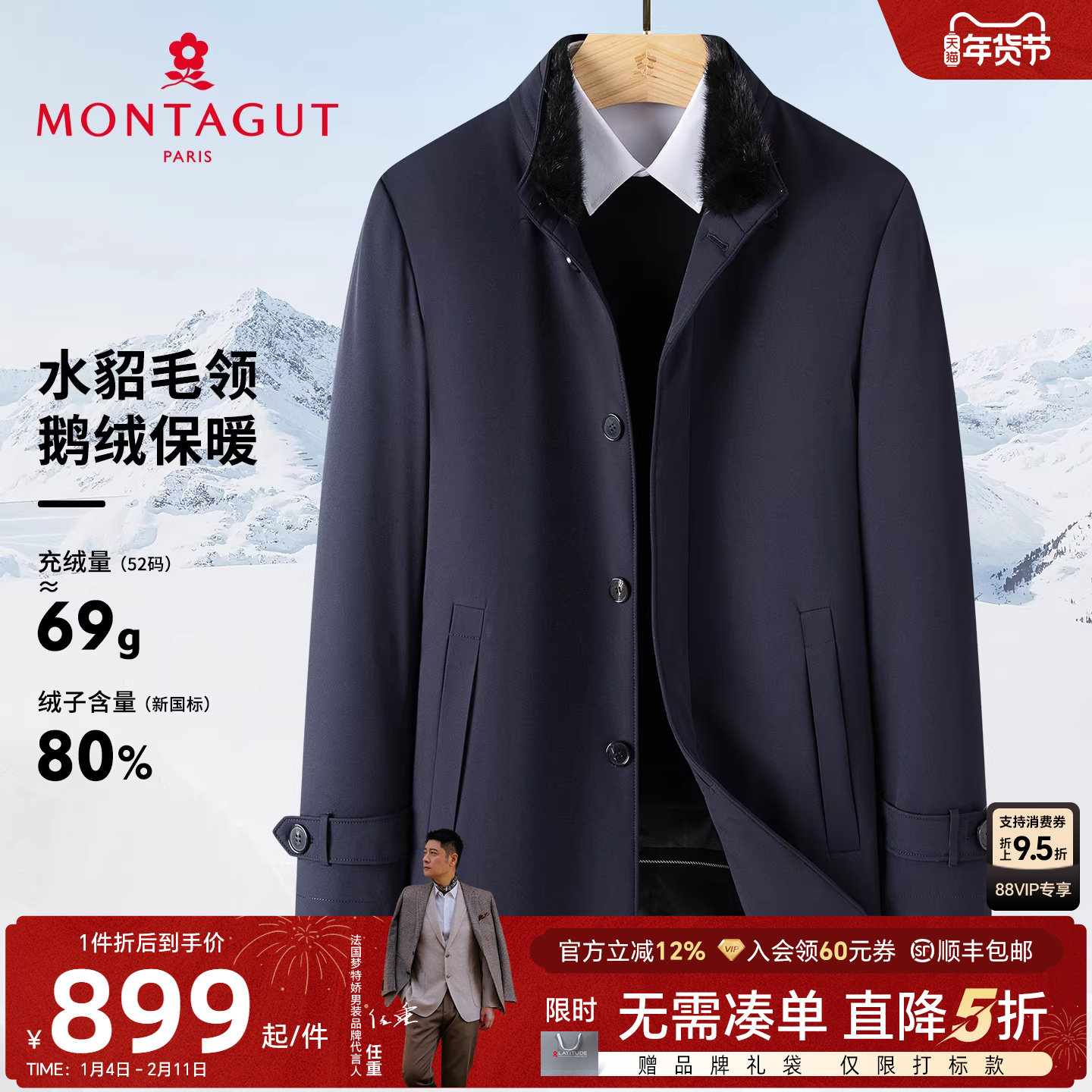 [水貂毛领/鹅绒内胆]梦特娇冬季男士羽绒服中长款鹅绒风衣外套厚J
