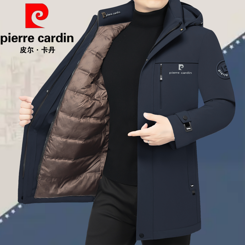 皮尔卡丹男士羽绒服中长款加厚保暖冬季新款中年休闲外套可脱卸帽