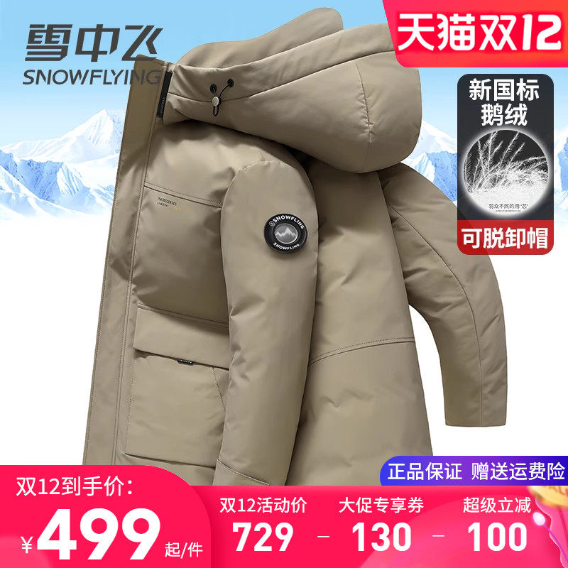 雪中飞男士羽绒服中长款连帽可脱卸冬季外套百搭休闲卡其色鹅绒服