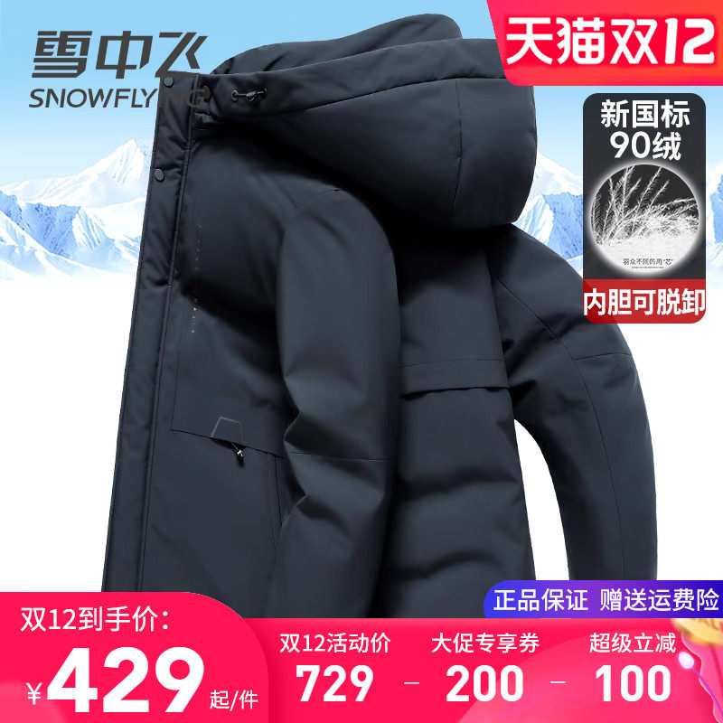 雪中飞中年男士羽绒服中长款连帽可脱卸冬季外套加厚保暖鹅绒服装