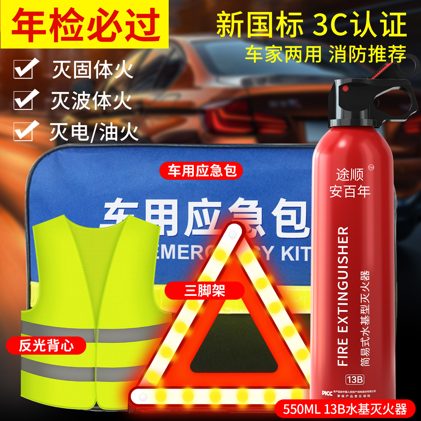 25年新款车载灭火器私家车3C小型汽车专用车用三件套小车年检套装