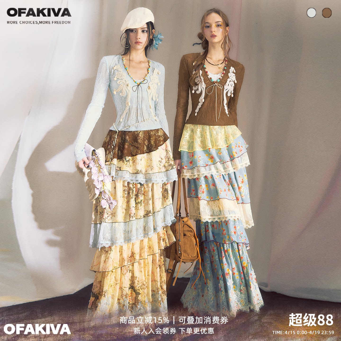 OfAkiva“蓝丹”重工盘绳串珠拼接假两件撞色蕾丝上衣蛋糕裙套装