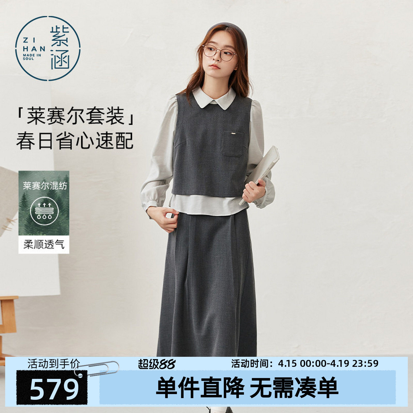 紫涵莱赛尔灰色假两件长袖上衣a字半身裙上下两件套装女春季新款
