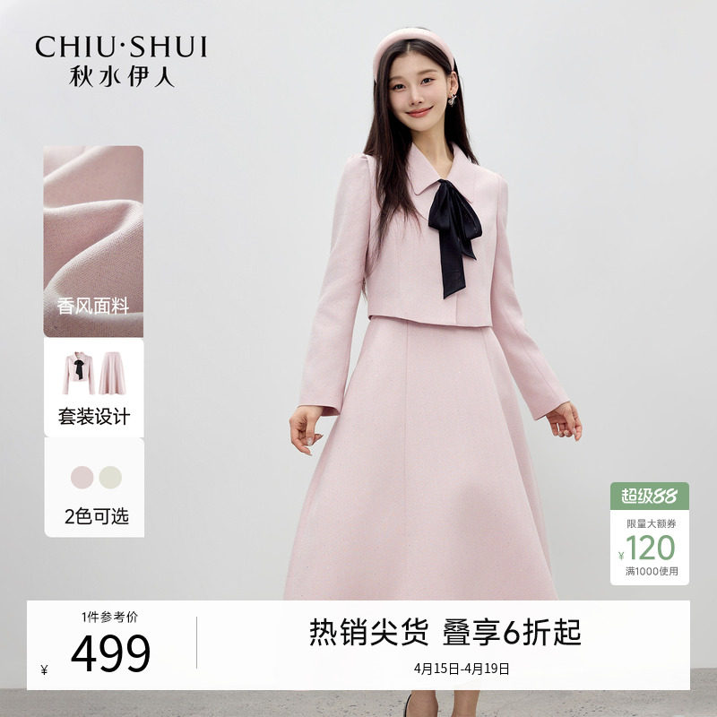 秋水伊人优雅蝴蝶结粉色两件套 2026年春季新款通勤裙子时尚套装