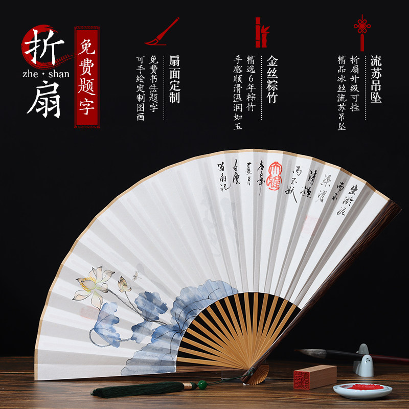 精品棕竹宣纸折扇定制书法手绘中国风苏工题字送外国人礼品古风扇