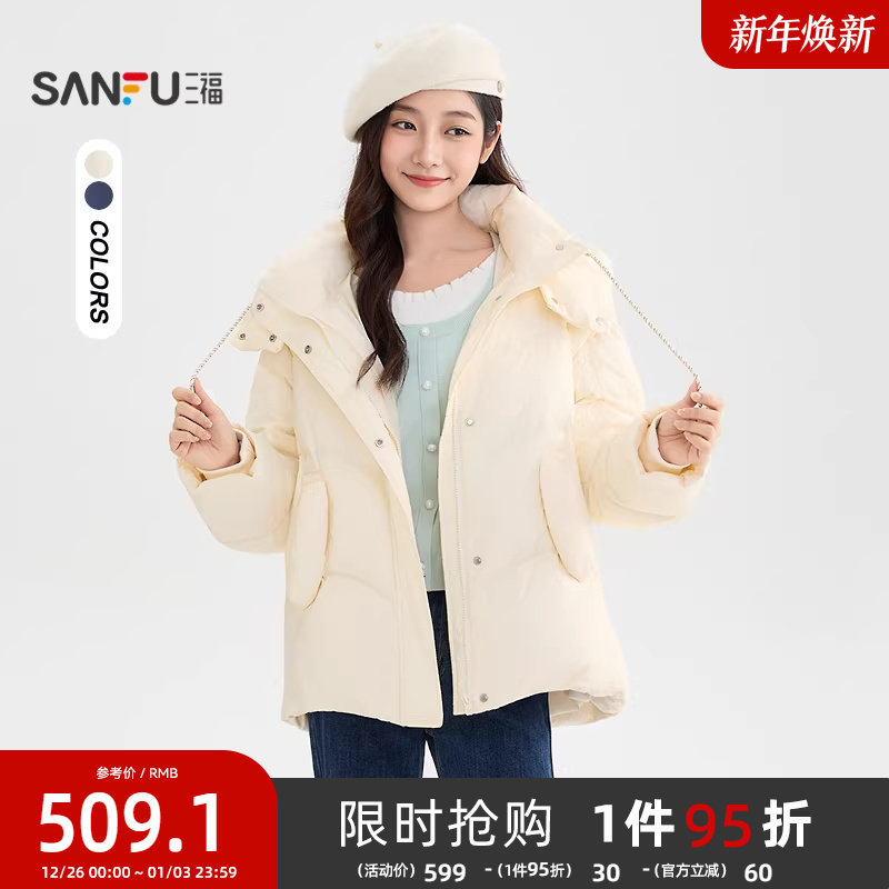 三福宽松羽绒服2025新款冬季超好看的保暖连帽泡芙外套女装511259