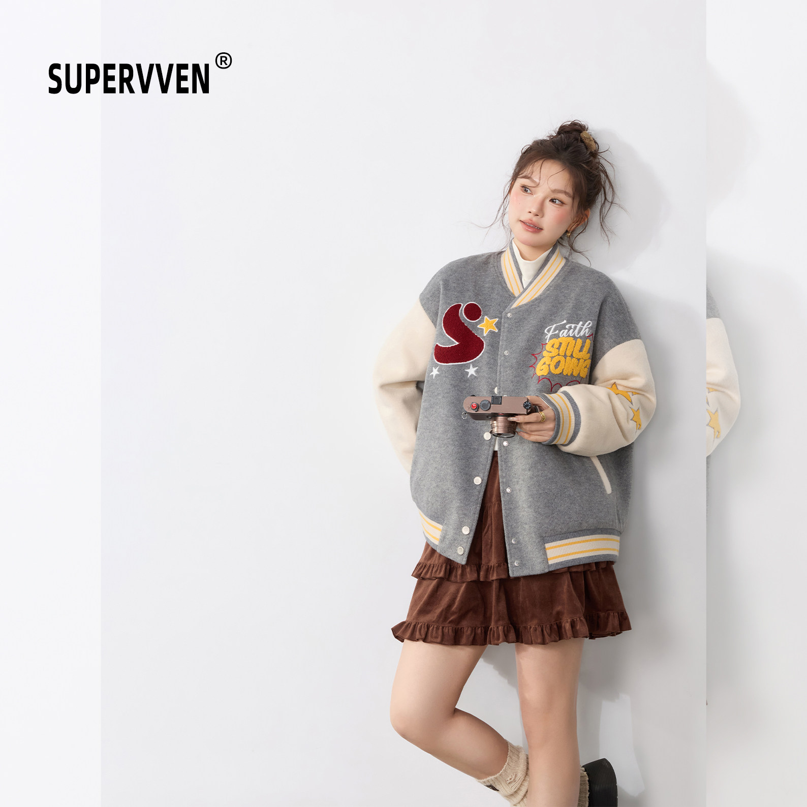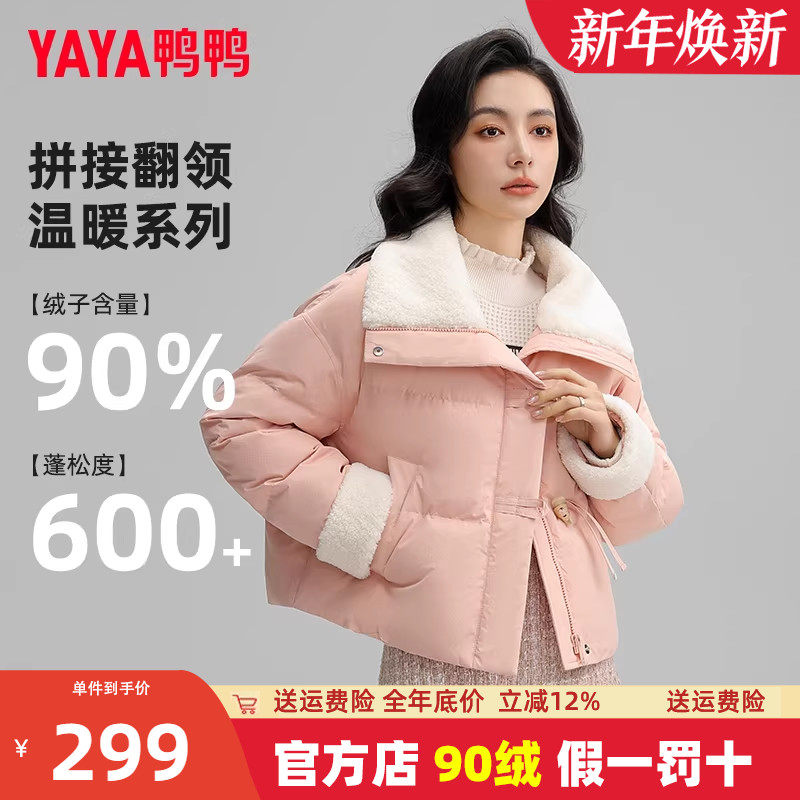 鸭鸭羽绒服女2024秋冬新款超短款宽松拼色仿羊羔毛翻领保暖外套SX