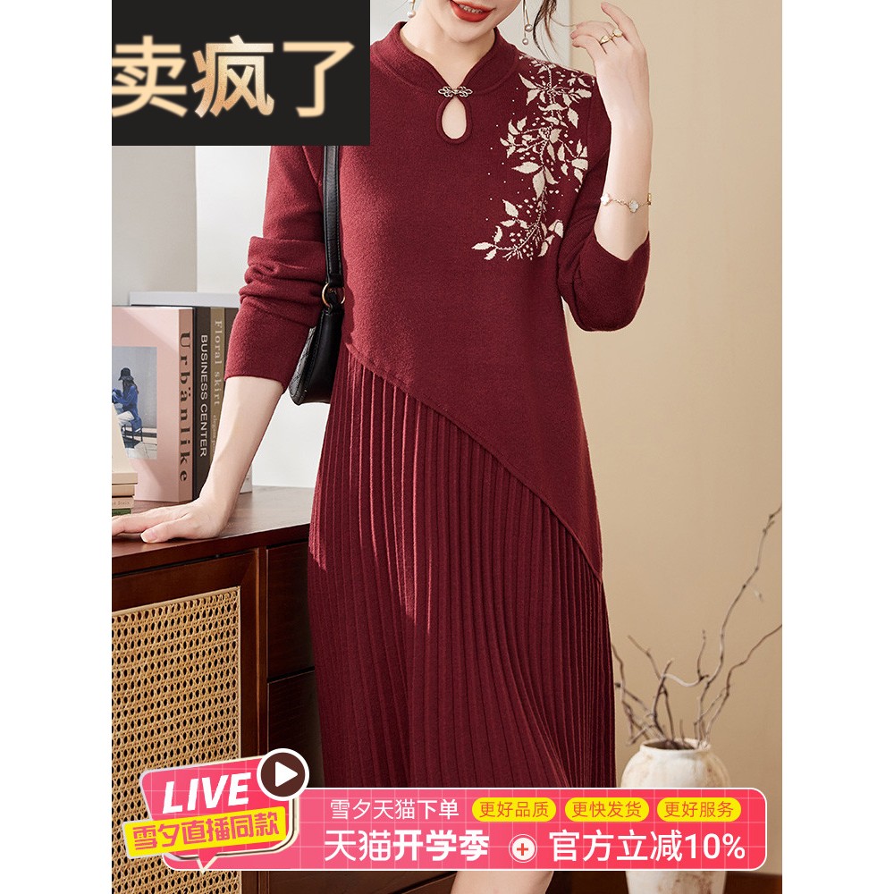 妈妈秋冬红色打底毛衣裙婚宴礼服中老年女高贵旗袍连衣裙蛇年衣服