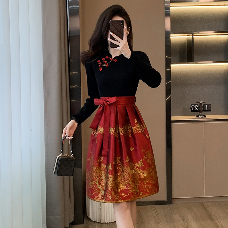 OSA欧莎过新年红色国风旗袍盘扣连衣裙女秋装气质针织毛衣长裙子