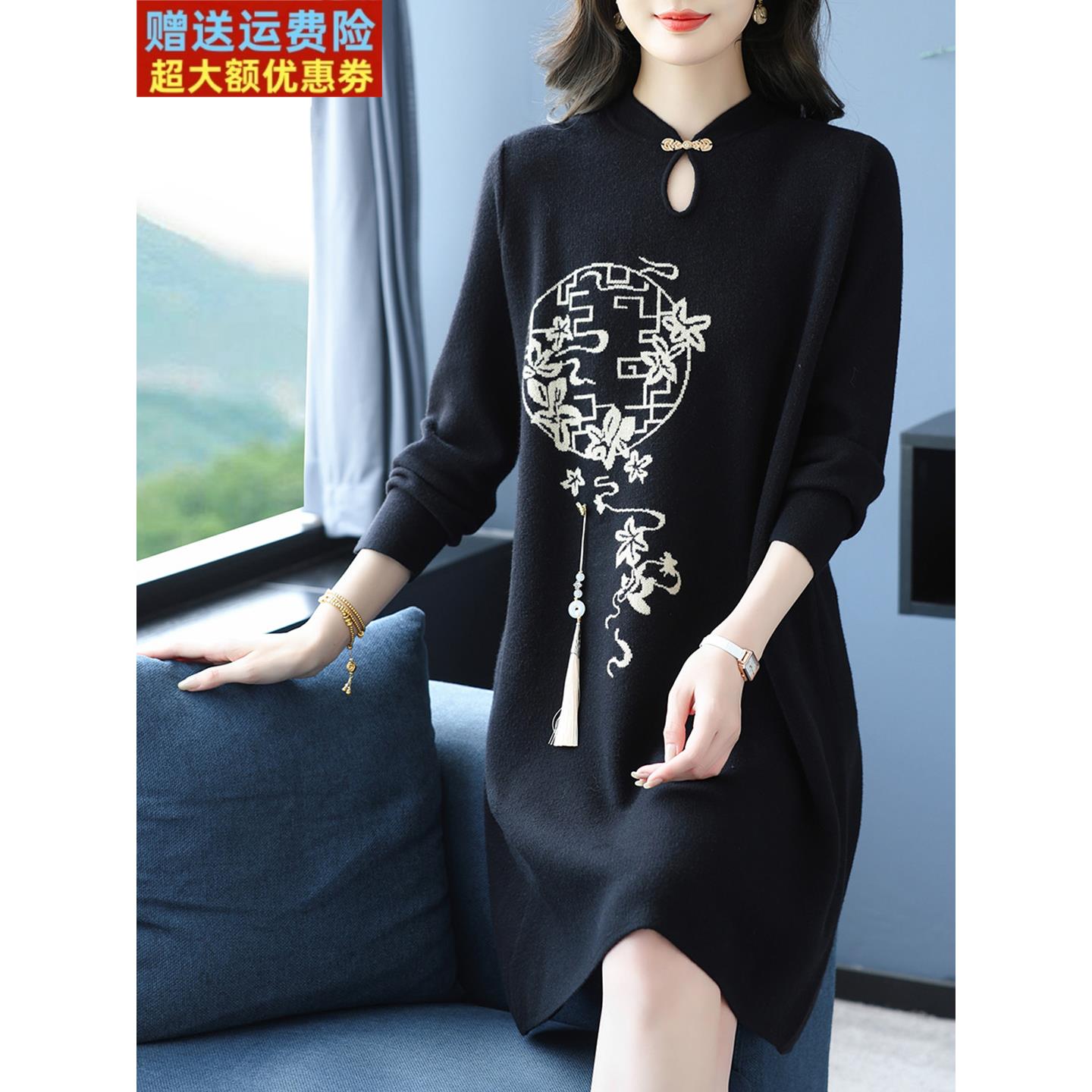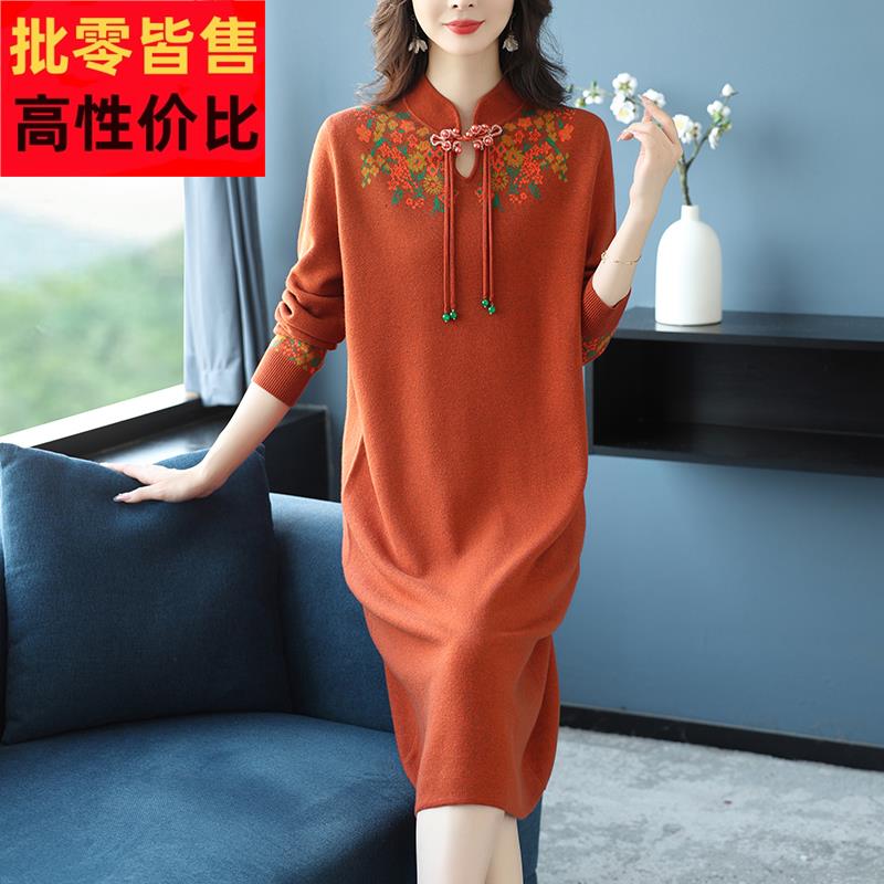 中年女士复古旗袍领针织连衣裙秋冬妈妈中长款宽松显瘦中式毛衣裙