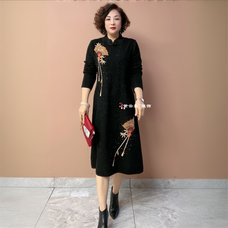 妈妈洋气旗袍连衣裙中年女秋冬装中长款打底衫中老年国风毛衣裙子