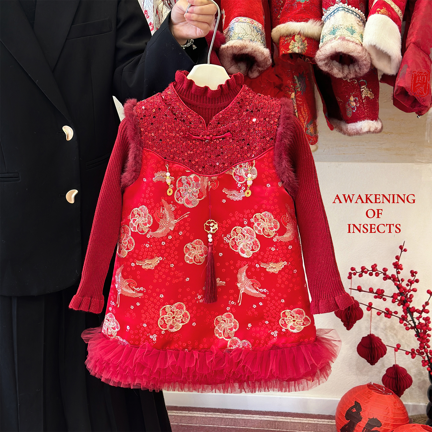 女童新中式连衣裙套装冬季新年红色女孩洋气时髦拜年服毛衣旗袍裙