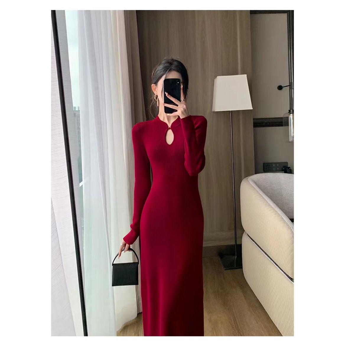 中长款外穿针织衫显瘦毛衣旗袍领修身打底衫女秋冬新款长袖连衣裙