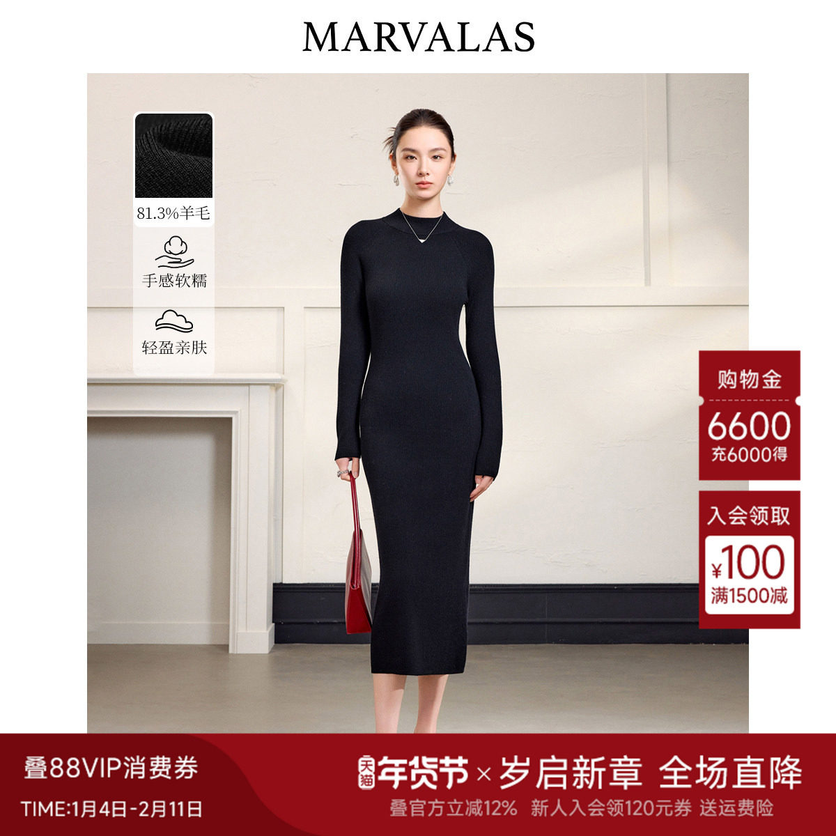 曼德诗纯色气质小黑裙2025秋季新款绵羊毛混纺弹力针织修身连衣裙