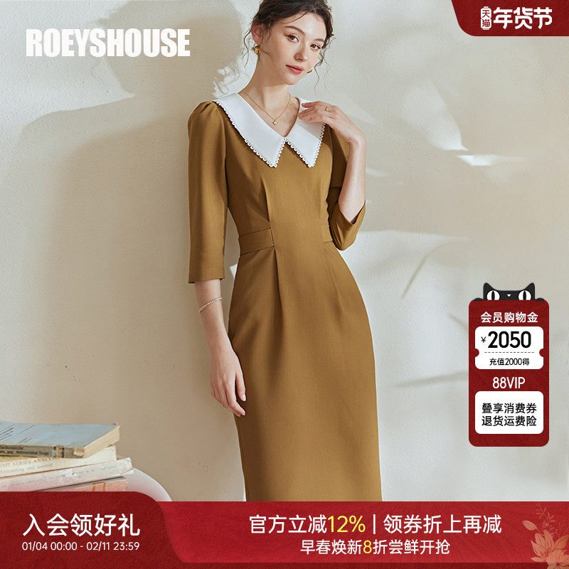 罗衣法式泡泡袖系带连衣裙女春简单大方娃娃领修身纯色裙子08234