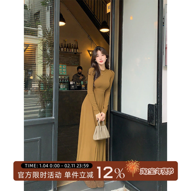 女洋气V领收腰修身针织打底裙纯色连衣裙中长裙法式气质针织春秋